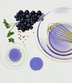 加熱ブルーベリー果汁75cc、フレッシュブルーベリー75g、シャンパンビネガー又はワインビネガー50cc、ピーナツ油・サラダ油・クルミ油のうちいずれか150cc、塩・コショウ・コリアンダー(各少々)